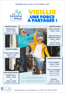 Du 06 au 10 octobre 2025, la semaine bleue met à l'honneur les aînés avec un programme varié: café part'âge, forum santé, atelier mémoire, jeux interactifs, marche bleue adaptée ou dynamique et Karaoké festif. Venez partager des moments conviviaux, découvrir des activités et renforcer le lien social au sein de notre ville.
